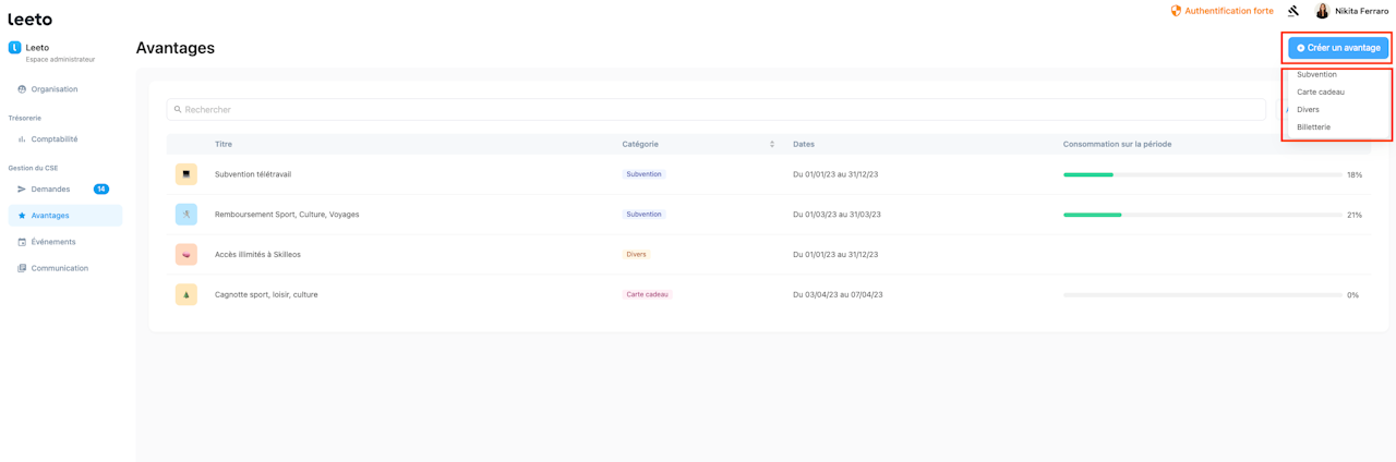 Vous cliquez sur le bouton "Créer un avantage" en haut à droite