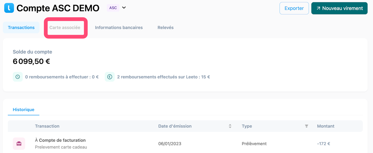 Vos cartes virtuelles sont accessibles depuis l'onglet Comptes > Compte ASC/AEP > Carte associée.