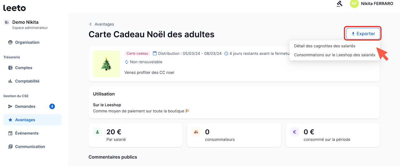 Si ces deux conditions sont réunies, c'est très simple : rendez-vous sur votre carte-cadeaux concernée et cliquez sur "Exporter" (en haut à droite).